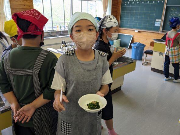 今日は5年2組がほうれん草のおひたしを作っていました。しっかり鍋で湯がいて、冷ましたほうれんそうを軽く絞って水気をなくし、5cm位の幅に切って、鰹節をかけ、醤油で味付けして、とても上手にできていました。作ったおひたしは、5年生からいただきました。とてもおいしかったです。