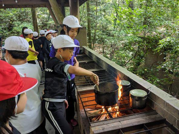 宿泊学習2日目です。私が10時くらいに自然の家を訪問すると、子どもたちは屋外の調理場でお米炊きとカレー作りを行っていました。みんなで協力して一生懸命に作っていました。私も少し手伝ったりしましたが、なかなか日頃の生活の中で火をたいたりする経験もないので、火をつけるのに悪戦苦闘していました。これも良い経験です。木の大きさを考えたり、新聞の使い方なども教えながら、火を大きくしていきました。お米がもう炊けたか確認をしたときに、なんと水が飯盒の中に入っていないという珍事件も起こりましたが、まあこれも良い経験です。失敗なくして成功はありません。これでたくさんのお土産話ができたことと思います。今晩は子どもたちから宿泊学習の出来事について聞いてもらい、楽しい夜ご飯にしてほしいです。