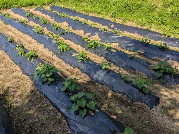 サツマイモ農園に行くと、6月13日に植えたサツマイモの苗が生長して、葉っぱもかなり数が増えてきました。