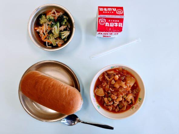 今日の献立は,鶏肉と野菜のトマト煮、ツナとブロッコリーのサラダ、コッペパン、牛乳です。