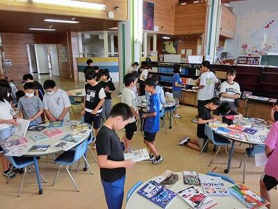 今日、1校時から3校時にかけて、選書会を行いました。今回は、セットの本を含めて、約250冊の本を準備していただきました。それらの本を、図書館のテーブルなどに並べていただき、児童がいろいろな本を見合いました。そして、気に入った本ベスト3を紙に書きました。
