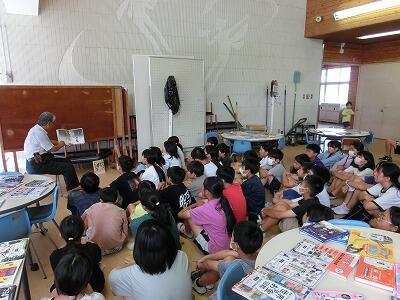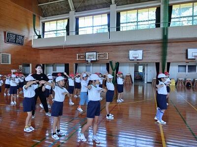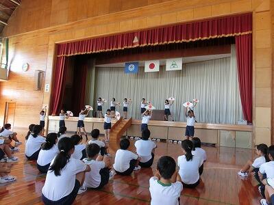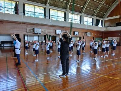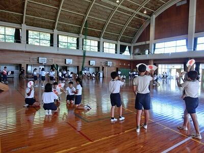 本年度の運動会で、全校児童が「ばんば踊り」を踊ります。ここ最近は、運動会での「ばんば踊り」はなかったそうなので、児童はほぼ知らないような状態です。ですから、地域の方々の力を借りて、今練習中です。「弓を引いて」とか「ながめて」とか「手を胸に付けて伸ばす」などと教えていただきながら練習しています。暑い中、体育館でご指導いただき、ありがとうございます。