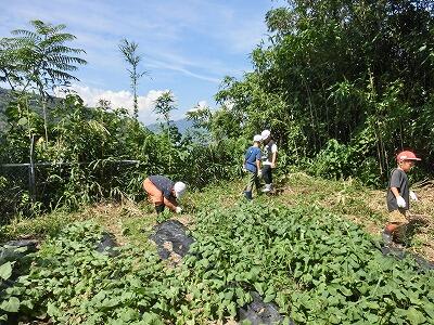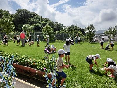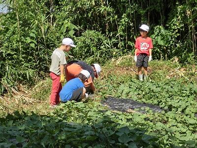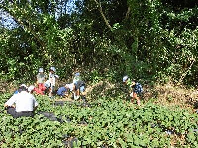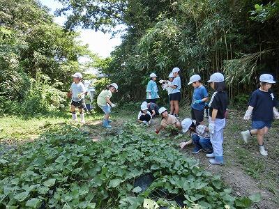 今日、2年生が久しぶりに芋畑に行きました。暑い中でしたが、草取りと芋のつるの観察をしました。教室に戻って、以前よりもつるが伸びていたり、葉っぱが増えていたりしている様子などを記録しました。収穫を待ち遠しく思っている子どもたちもいました。