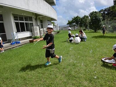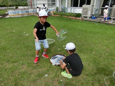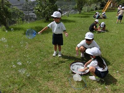 今日、1年生が生活科「なつとあそぼう」で、シャボン玉作りをしました。暑い日差しの中、うちわの骨だけのものやハンガーを丸くしたものなどを使って楽しみました。小さなシャボン玉はよく出来ていましたが、大きなものはなかなか難しかったようでした。活動後に、「シャボン玉がきれいだった。」「大きいのができてうれしかった。」などの感想が聞かれました。