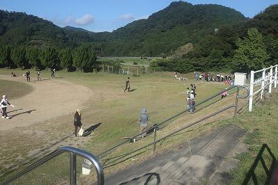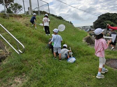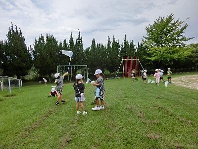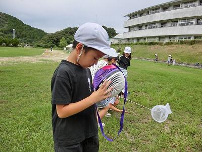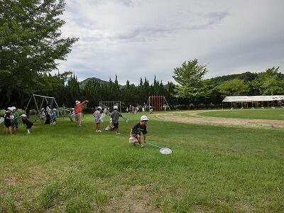 1年生が運動場に出て、バッタやトンボなどの虫を一生懸命に追いかけてつかまえていました。今日は、日差しが弱く、虫取りにはよい天気でした。運動会に向けて、運動場は草刈りをしていますが、バッタが結構いました。子どもたちは喜んで虫を追いかけていました。