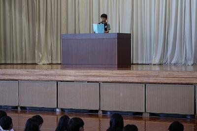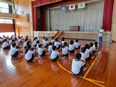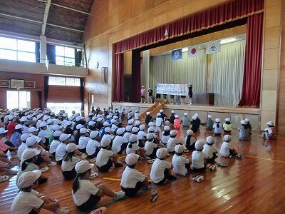 本日、全校児童を体育に集めて始業式を行いました。意見発表では、2年児童が代表で「漢字の勉強を頑張りたい、ゴミ拾いをして地域をきれいにしたい、立腰の姿勢でしっかり話を聞くようにしたい」と発表しました。はきはきと作文を読んでいて、しっかりと伝わってきました。まだまだ暑い日が続きますが、充実した2学期にしてほしいと思います。