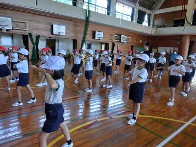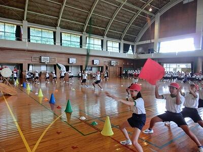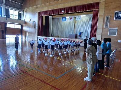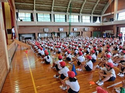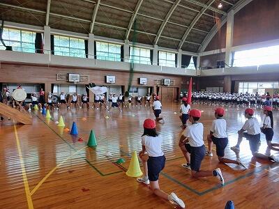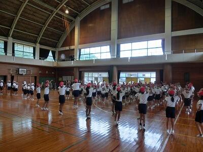 本日、全校体育第1回目を行いました。雨天のため、急きょ体育館で行いました。主な内容は、開会式、エール交換、閉会式でした。団長さんをはじめ、リーダーの子ども達が大きな声を出して、緊張感のある練習が出来ました。