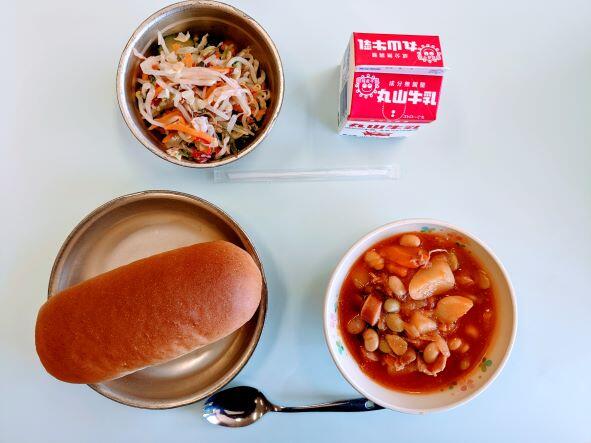 今日の献立は、ポークビーンズ、海藻サラダ、牛乳、コッペパンです。