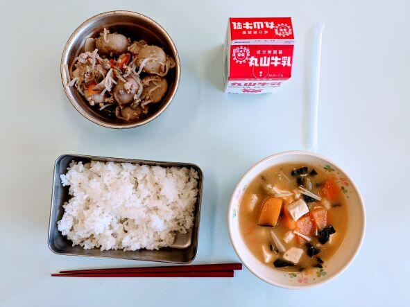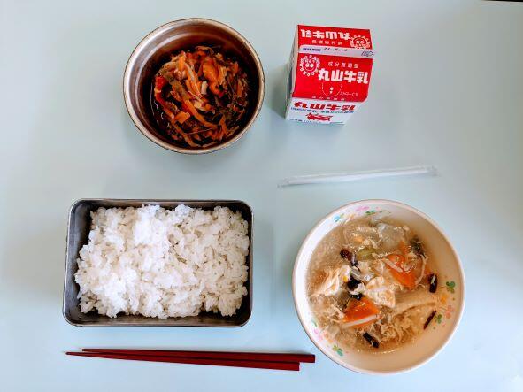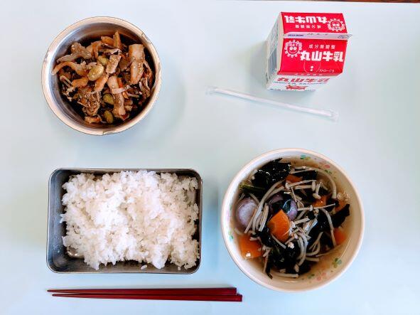 今日の献立は、うおそうめん汁、茎わかめのきんぴら、牛乳、ごはんです。