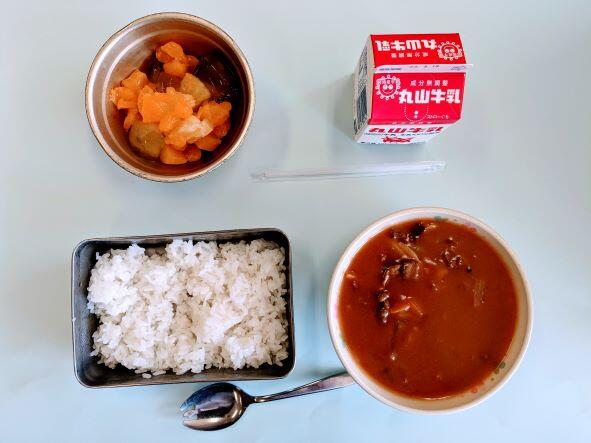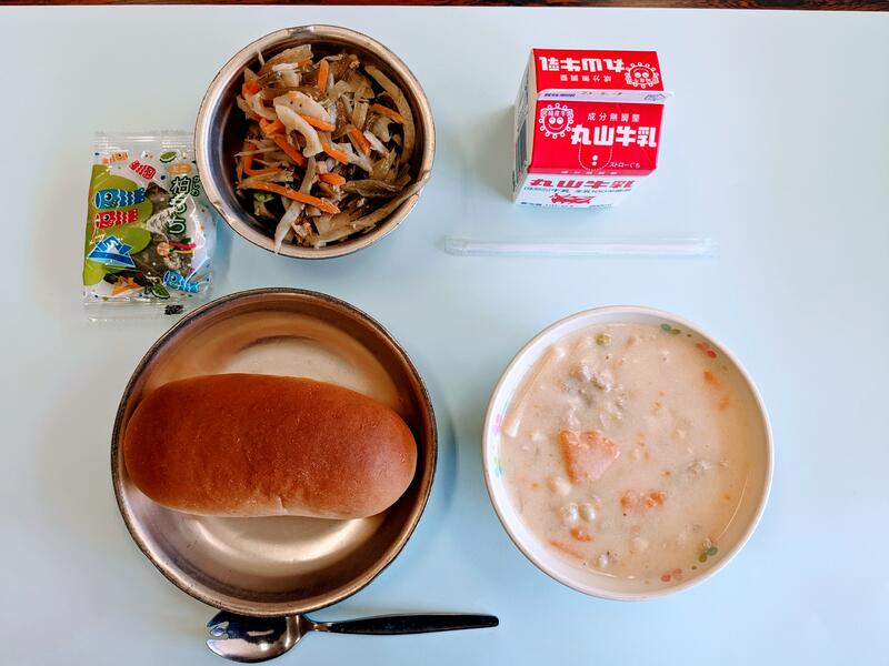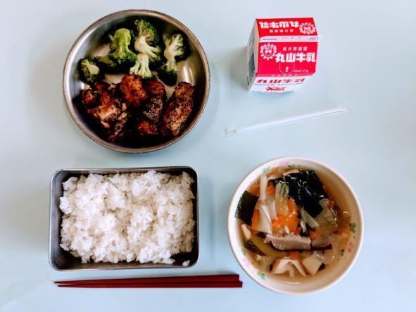 今日の献立は、カボチャの味噌汁、里芋のそぼろ煮、ご飯、牛乳です。カボチャ、里芋、ご飯と炭水化物が多い日でしたが、午前中に草刈りをして体力が消耗していたので、味噌汁の塩味と炭水化物により、体力が回復した感じです。とてもおいしかったです。