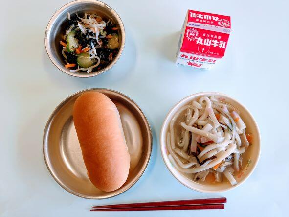今日の献立は、五目うどん、梅おかか和え、コッペパン、牛乳です。