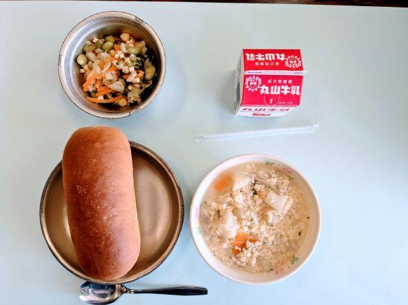 今日の献立は、ふわふわスープ、コロコロチーズサラダ、コッペパン、牛乳です。