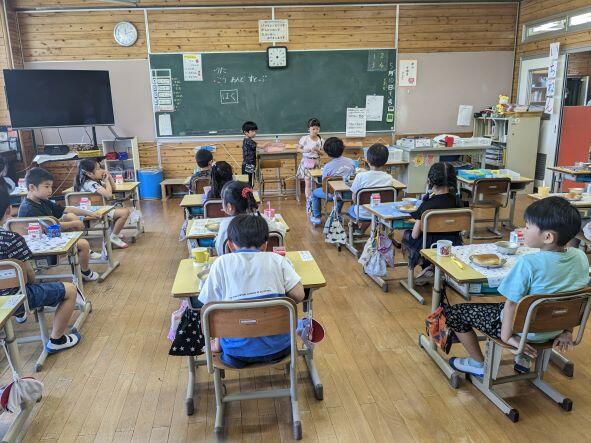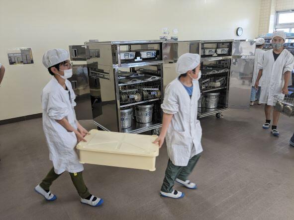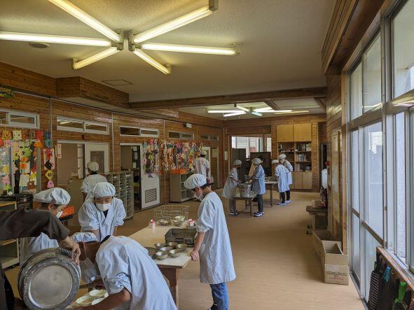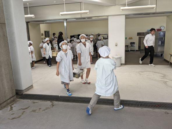 給食の準備の時間になると給食準備室には、給食当番の子どもたちが集まってきます。きちんと並んで食缶などを取って運んでいきます。1年生の教室では廊下で6年生が配膳し、1年生はイスに座って、配膳するのを待っています。みんな静かにしっかりと給食の準備ができています。