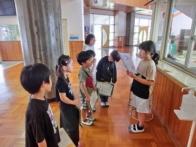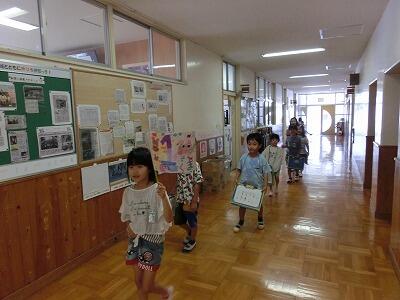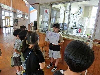 今日、2年生が1年生に学校内を紹介する「学校たんけん」を行いました。紹介した場所は、①なつかし通り(昔の道具等が置いてある2階通路)、②給食室、③図書館、④理科室、⑤家庭科室、⑥音楽室、⑦事務室、⑧校長室、⑨職員室、⑩保健室でした。
