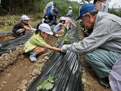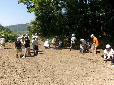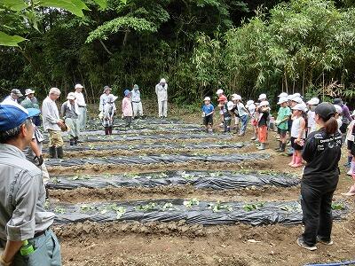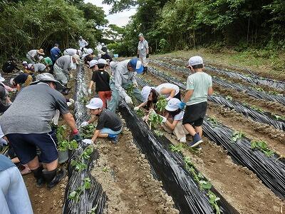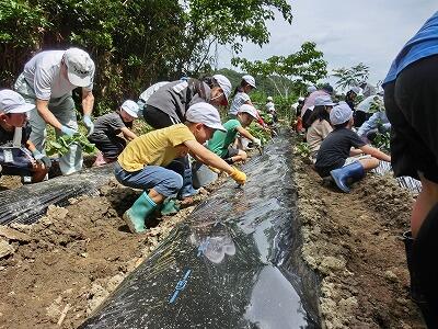 子どもたちは、4つのグループに分かれて、それぞれに竹を持ち、斜めに穴を開け、そこに芋の苗を入れてぎゅっと押さえることを繰り返し、協力して植えていきました。400本ほどあった苗は、ほぼ植え終わりました。最後に、芋がたくさんとれますようにとみんなで祈って終わりました。協力者の方々、ありがとうございました。