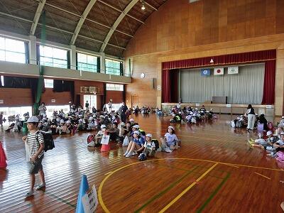 本日午後、風水害引き渡し訓練を行いました。初めに地区ごとに集まって人数を確認し、体育館へ移動しました。そして、それぞれお迎えを待ちました。