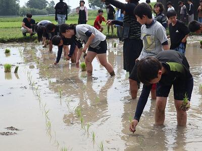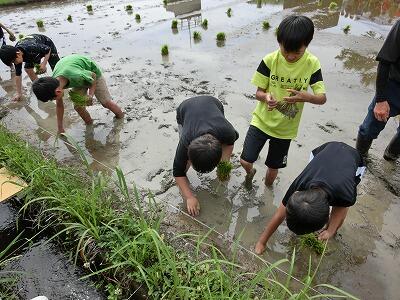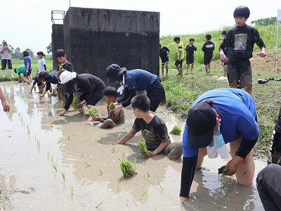 植え方の要領が分かったところで、4つのグループに分かれて植えていきました。子どもたちからは、「思うように動けなくてたいへんだった。」などの感想が聞かれました。最後の方では、保護者の方々にも田に入っていただきました。学校協力者の方々も暑い中、大変お世話になりました。ありがとうございました。