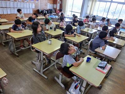本年度も、むし歯予防のためのフッ化物洗口が始まります。今日は、第1回目ということで、水を使っての練習をしました。水を口に含んで、頭を前に、右に、左に傾け、口の中の隅々まで水が行き渡るように練習しました。次回から、本格的に実施する予定です。