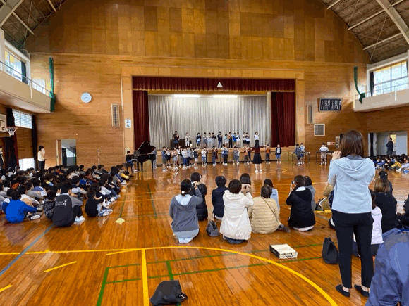 合奏は、リコーダーや鍵盤ハーモニカ、鉄琴、木琴など様々な楽器の音色が体育館に響きました。