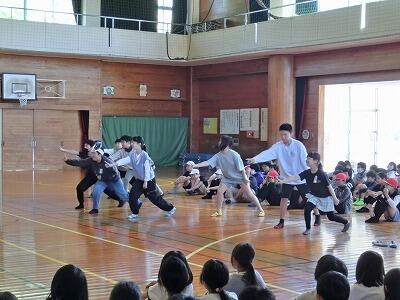 校歌を歌った後に、6年生が歓迎の言葉を発表しました。「伊形小の1年間の行事」と題して、伊形レンジャーが登場して次々と主な行事を発表しました。その内容は、参観日、遠足、水泳、運動会、鑑賞教室、各学年の体験的な行事で、グループごとに言葉と動きをつけて、分かりやすく楽しく伝えてくれました。発表のおおまかな内容は決まっていましたが、それを基に6年生が自分たちで言葉を追加し、動きも考えて当日の発表になったそうです。素晴らしい発表でした。1年生も、言葉を覚えてみんなでそろえてお礼の言葉を述べていました。とてもしっかり言えていました。
