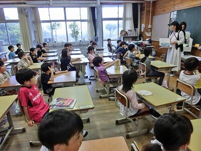 1年生の読み聞かせでは、「おや おや おやさい」や「あっちゃん あがつく たべものあいうえお」を読んでいただきました。2年生は、「あめたろう」や「かたつむりののんちゃん」を読んでいただきました。どちらの学年も真剣に聞き入り、楽しんでいました。さくら草の会のみなさん、ありがとうございました。