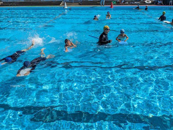 梅雨明けかと思うくらい、雲一つない晴天のもと、水泳学習が行われています。5年生では2つのグループに分かれて、基礎・基本の徹底を図りながら学習を進めています。今日はビート板を使い、バタ足の動きをチャックしながら泳いでいました。見学者もタブレットをもって、泳いでいる児童の動画を撮って、練習の工夫につなげています。水泳はとにかく泳ぐことが大事ですから、繰り返し泳ぎ、泳力を高めてほしいです。