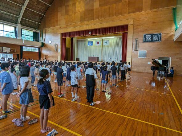 早いもので今日は1学期の終業式でした。終業式では2名の児童が作文を発表しました。1学期頑張ったことやこれから夏休みや2学期に向けて頑張ることなどについて発表しました。私は1学期頑張ったことや「幸動」についてと夏休みの約束などについて話をしました。最後にあいさつ標語やスポーツ大会の表彰を行いました。