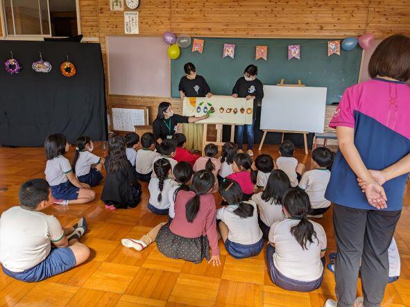 今日は2時間目から4時間目まで、1年生から3年生を対象にお話会を行っていただきました。読み聞かせボランティアの方々に読み聞かせ等を行っていただきましたが、とっても楽しい雰囲気の中で子どもたちは集中して聞き入っていました。途中着ぐるみも登場し、会場は大賑わい。楽しい時間を準備していただき、本当にありがとうございました。