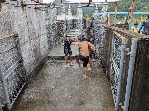 今日は1年生がプール開きでした。小学校に入って初めてのプールなので、とても楽しみにしてきた感じが伝わってきました。体育館で準備運動を終えてプールに入ってきた1年生は、まずはじめにシャワーを浴びました。水が冷たいので「キャーキャー」と叫ぶ子や黙って我慢強く耐える子などいろいろな表情が見えました。シャワーの後はプールに入って、水遊びを行いました。とっても楽しそうな表情にこちらも元気をいただきました。