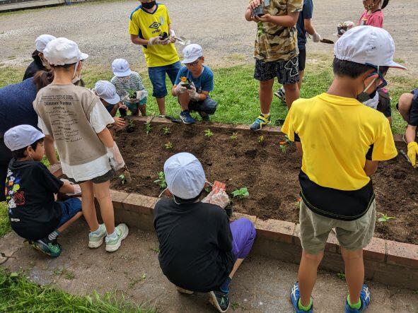 13名の学校協力者、8名の保護者も参加していただき、子どもたちと一緒に植えました。地域や家庭の協力で学校の授業ができることは本当に幸せなことだと思います。子どもたちも笑顔いっぱいで楽しく芋植えができていました。芋掘りまでの水やりや雑草取り、成長の記録などいろいろすることがありますが、みんなと協力して取り組んでほしいと思います。