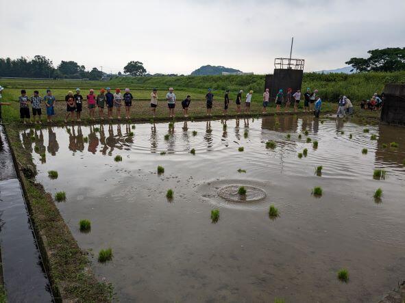 今日は5年生が田植えを行いました。学校近くのお借りしている田んぼに集まり、稲吉さんから苗の植え方を教えていただいたり、東臼杵農林振興局の職員の方から、田んぼの役割について説明をしていただきました。