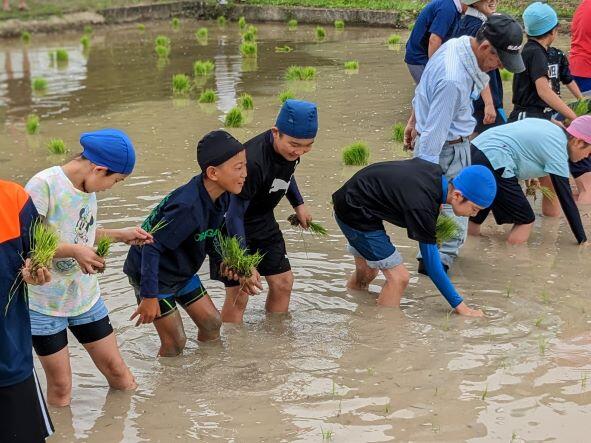 説明などを聞いた後は、早速苗を植えていきました。少し水が多かたので苗を植えるのに苦労していましたが、子どもたちはとっても元気よく楽しく植えることができていました。1本の苗からどのくらい収穫できるかという課題も与えられ、これからの苗の生長を見守る意欲が高まったと思います。観察や草取りなども行いながら、餅つきまでしっかりと頑張ってほしいと思います。協力していただいた皆様ありがとうございました。
