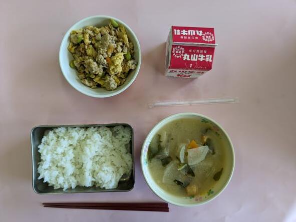 今日の献立は、鶏そぼろ丼、大根の味噌汁、ご飯、牛乳です。鶏そぼろ丼は鶏ミンチ、卵、煮大豆、人参、タマネギ、青豆などたくさんの具が入り、少し甘めの醤油味で、ご飯にかけて食べると最高!食欲をそそり、おかわりをしたくなりました。子どもたちも好みそうな味付けでとてもおいしかったです。