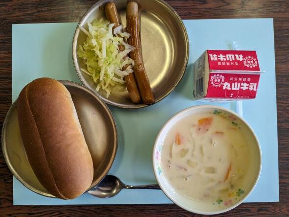 今日の献立は、ポテトコーンスープ、添え野菜、セルフホットドッグ、牛乳です。自分でホットドッグのパンに添え野菜のキャベツと長いウインナーを挟んで食べるのでセルフホットドッグという名前になったのでしょうが、自分でできるので、子どもたちも喜んで食べたことでしょう。とてもおいしかったです。