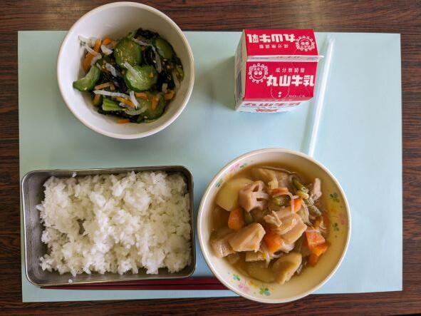 今日の献立は、鶏肉のさっぱり煮、大根とわかめの酢の物、牛乳、ご飯です。鶏肉のさっぱり煮は、じゃがいも、ゴボウ、レンコン、人参、こんにゃく、いんげん、などの野菜がたっぷり入って、少し甘めの味付けで、しっかり野菜に出汁がしみ込んでいて、とてもおいしかったです。