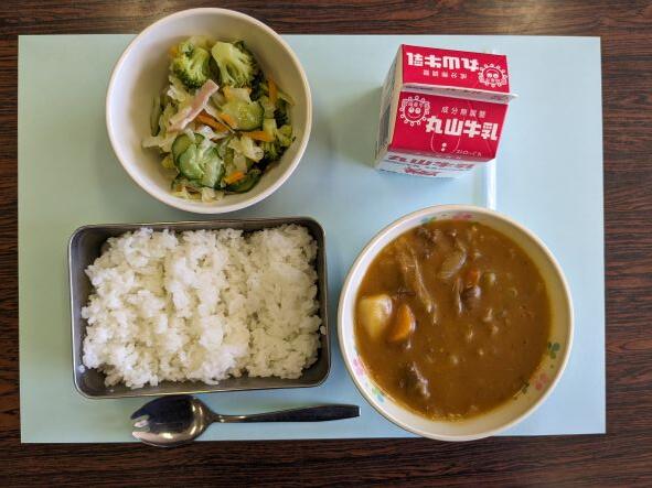 今日の献立は、ビーフカレー、ハムサラダ、牛乳です。カレーライスはインド発祥でもう日本の料理みたいに思っていますが、インド料理を元にイギリスで誕生したそうです。イギリスから明治時代に伝わり、日本で独自に変化・発展した料理だそうです。