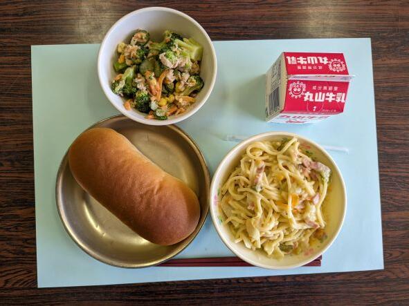今日の献立は、春キャベツとベーコンのスパゲッティ、ツナサラダ、コッペパン、牛乳です。