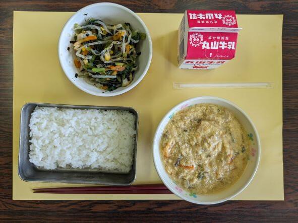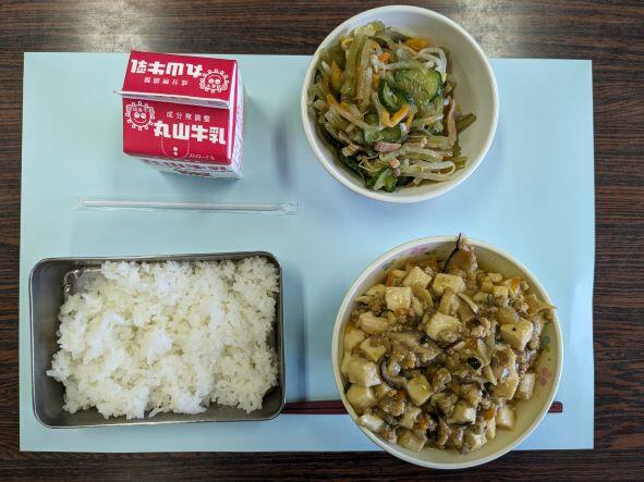 今日の献立は、麻婆豆腐、茎わかめのナムル、ご飯、牛乳です。麻婆豆腐は挽き肉、豆腐がたっぷり入って、少し辛めの味付けで、ご飯とぴったりでした。茎わかめのナムルは、茎わかめのとろとろ感が有り、少し酸味でさっぱりして、おいしかったです。