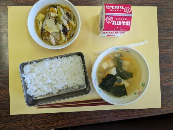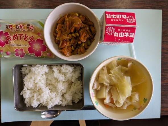 今日は子どもたちが大好きな鶏の唐揚げで、カラッと揚げられていて、とてもおいしかったです。今週は雨の日が多く、外で遊ぶことがあまりできませんでしたが、今日は味噌汁の春キャベツを食べて、昼休みは外で、残りの春を感じながら遊んでほしいと思います。
