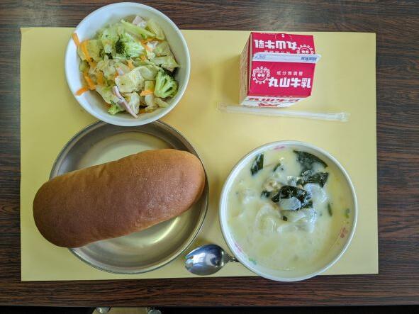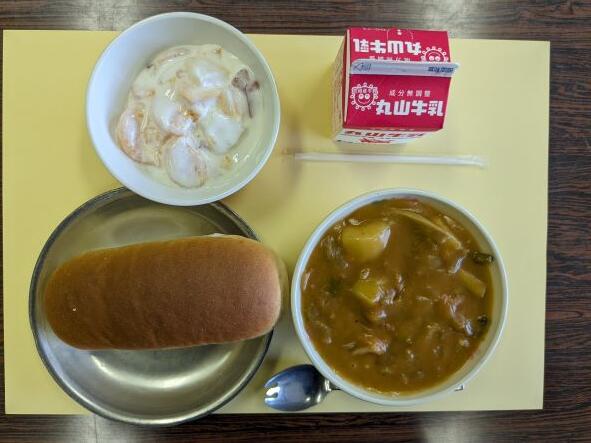 今日の献立は、シーフードのトマトシチュー、フルーツヨーグルト、コッペパン、牛乳です。