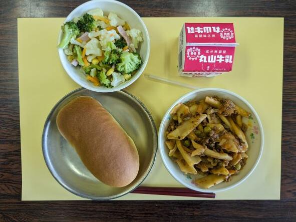 今日の献立はペンネボロネーゼ、花野菜サラダ、コッペパン、牛乳です。今年度初めての給食ということで、久しぶりの給食はやっぱりおいしいですね。ペンネボロネーゼはにんにくがしっかりきいて、ケチャップやトマトビューレ、デミグラスソース等で挽き肉にしっかりと味がしみていて、とてもおいしかったです。