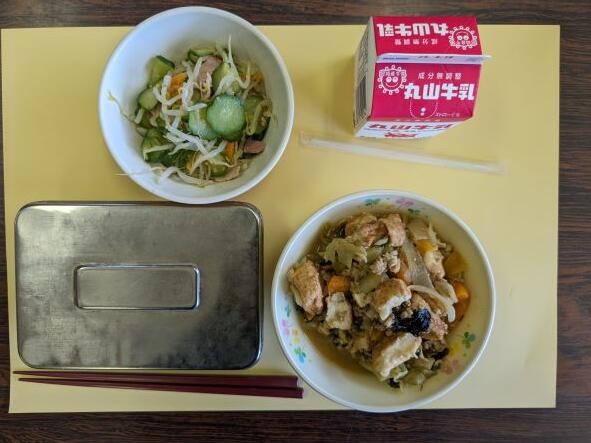 今日の献立は、厚揚げとチンゲン菜の肉みそいため、もやしのナムル、ご飯、牛乳です。肉味噌炒めで野菜嫌いな子どもでも食べやすい味付けでした。もやしのナムルもさっぱりしておいしかったです。
