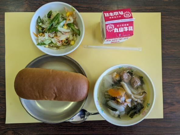今日の献立は、肉団子スープ、かにかまとアスパラのサラダ、コッペパン、牛乳です。