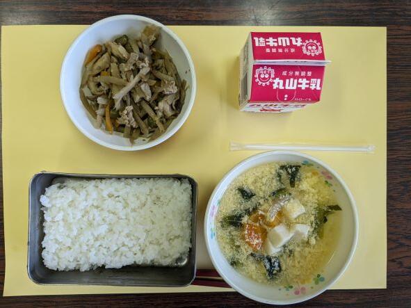今日の献立は、かき玉汁、きんぴらゴボウ、ご飯、牛乳です。ゴボウ、こんにゃく、人参、インゲンなど、食物繊維たっぷりのきんぴらゴボウですが、白ご飯と相性バッチリで、食欲が高まりました。午後からは入学式の準備ですが、おかげでしっかりがんばれます。
