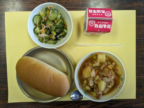 今日の献立は、ポークビーンズ、海藻サラダ、コッペパン、牛乳です。ポークビーンズは豚肉と豆を主な材料としたトマト味の煮込み料理です。アメリカの代表的な家庭料理ですが、給食では昔からつくられているメニューですね。大豆も柔らかくとてもおいしかったです。