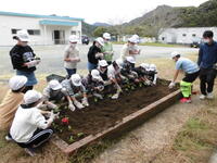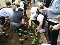 11月17日。4年生が学級の花壇にキンセンカ、パンジー、リビングストンデージーなどの苗を植えました。花の苗は、本校の学校技術員が種をまき、丁寧に育てたものです。春が楽しみです。