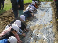 12月7日。3年生は、運動場西側にある畑にタマネギの苗を植えました。地域の方にマルチをはっていただいた畑に、丁寧に植えていました。3月には収穫できると聞いて、3年生はとても楽しみにしていました。