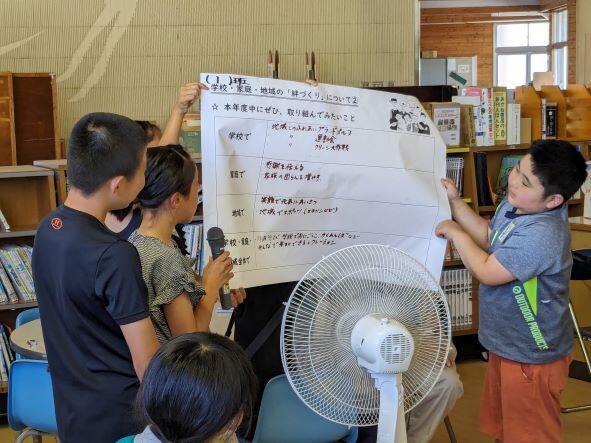 6月18日(火)の5・6時間目に学校運営協議会を行いました。今回の協議会には、6年生の児童も参加し、学校運営協議会の委員やPTA役員、保護者の皆さんと一緒になって、話し合い(熟議)を実施しました。熟議では学校・家庭・地域の絆作りというテーマで話し合いを行いました。まずはグループに分かれ、学校・家庭・地域の絆に関する課題について意見が出され、付箋に記入しながら意見の分類を行い、各グループごとに課題等について発表しました。その後、学校・家庭・地域で今年度取り組みたいことも話し合い、数グループが全体で発表しました。子どもたちはしっかりと課題を分析し、その解決のために具体的な取組を提案することができたので、子どもたちを熟議に参加させて、とても良かったと感じました。