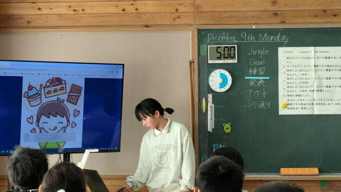 今日の外国語活動では、6年生が自分の夢や目標について英語で発表しました。なりたい職業は?ということで野球選手・バスケット選手・大工・パティシエ・美容師などいろいろな職業が出てきて、みんな堂々と英語で発表することができました。