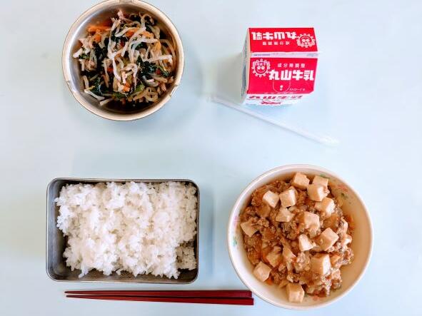 今日の献立は、麻婆豆腐、焼き豚ともやしのナムル、ご飯、牛乳です。挽き肉や豆腐がたくさん入っていて、甘辛の味付けは子どもたちにも抵抗なく食べられ,白ご飯にかけて食べたくなりました。とてもおいしかったです。湿気が高く,食欲がない日にはもってこいのメニューですね。